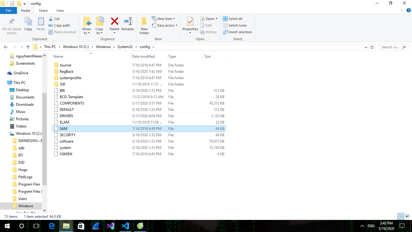 Trong mỗi một hệ điều hành , luôn có một nơi có thể chứa user, password của người dùng lưu trữ, và ở hệ điều hành WINDOW, thông tin cá nhân được lưu ở tệp SAM, bạn có thể xem ở C:\Windows\System32\config và ở đây chúng ta có thể thấy được tệp SAM.